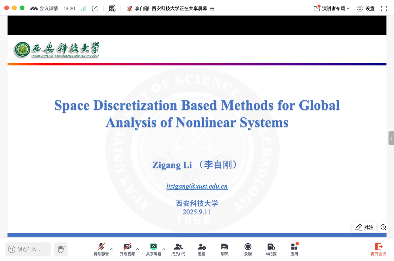9月11日下午,陕西科技大学李自刚教授应ylzz总站线路检测中心邀请在线上作题为“Spatial Discretization Based Methods for Global Analysis of Nonlinear Systems”的学术报告,相关专业师生20余人参会。